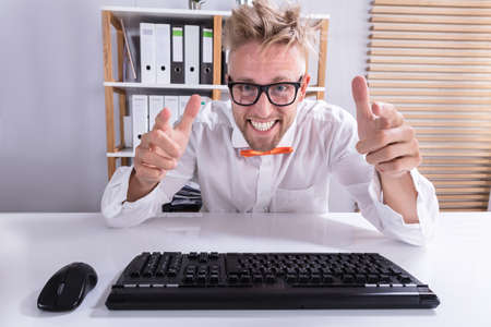 Close-up Of Keyboard In Front Of Pointing Happy Businessman Wearing Eyeglasses