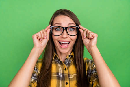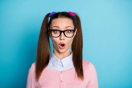 Oh no! Close up head shot photo portrait of confused speechless shocked pretty cute with big eyes she her people person look see watch at you camera adjust touch specs isolated vivid background