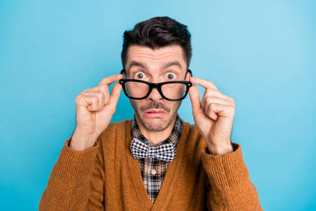 Photo of shocked amazed young man take off glasses fake news reaction isolated on blue color background