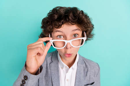 Photo of adorable impressed school boy wear grey jacket arm spectacles big eyes isolated turquoise color background