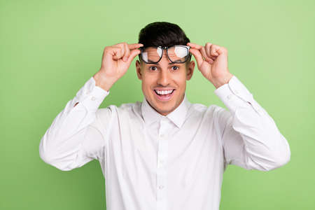 Photo of sweet impressed young guy dressed white shirt arm glasses smiling isolated green color background
