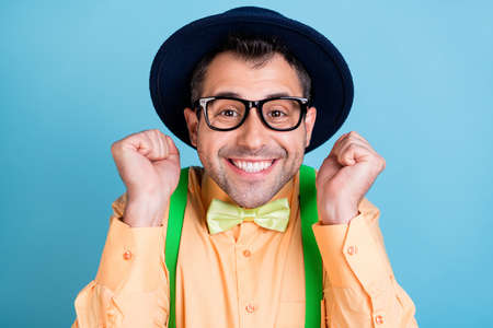 Photo of funny brunet man hands fists wear headwear eyewear peach shirt spectacles isolated on blue color background