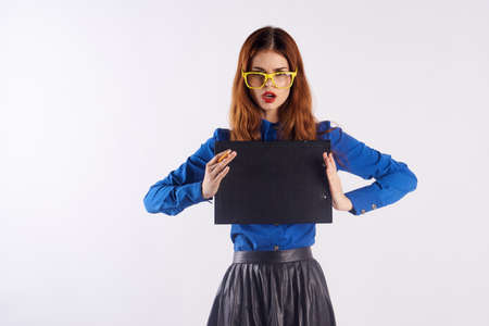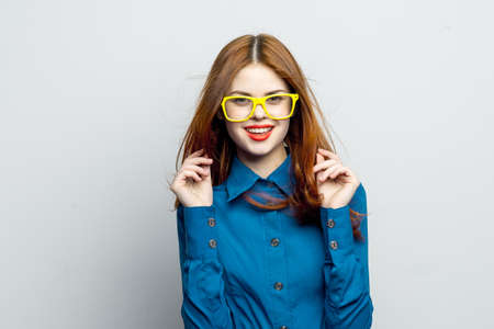 woman with multicolored glasses on her face in blue shirt posing glamor