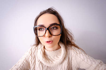 Funny girl face. Little kid girl 12,13, 14 years old in eyeglasses on isolated background. Children studio portrait. Emotional kids face.