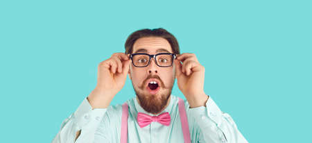 Wow, look at that. Headshot of funny surprised nerd. Geeky adult man wearing glasses, shirt and pink bow tie standing on turquoise studio background and looking at camera with amazed face expression