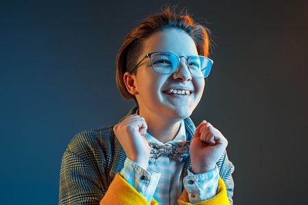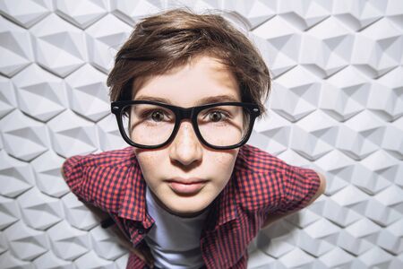 A portrait of a young stylish boy in glasses posing near the white wall in the studio. Kids, fashion, casual style, optics.