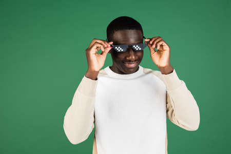 African mans portrait isolated on green studio background with copyspace