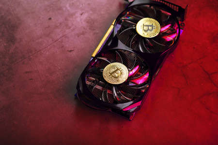 On the fans of a powerful video card, the coins of the Bitcoin cryptocurrency with a red backlight are displayed. The concept of mining and mining of cryptocurrency a cryptocurrency farm.