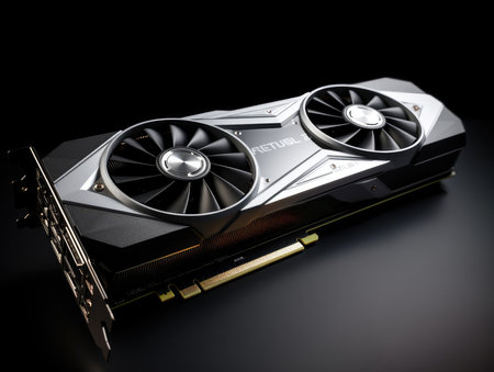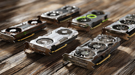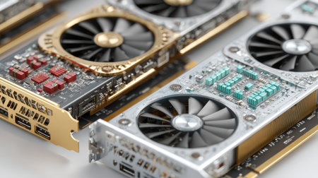 Close-up of new graphic processing units (gpus) with illuminated cooling fans and visible electronic components, highlighting the advanced technology