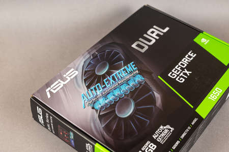 ASUS GFORCE GTX 1650 graphics card against a gray background. modern computer components. Ukraine, Nikolaev - 02 09 2022