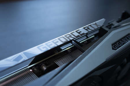 Tyumen, Russia-april 26, 2021: Graphic video card Gigabyte logo 1660 GTX. Cryptocurrency concept.
