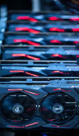 Bitcoin and cryptocurrency miner - a mining computer. Close-up on several GPU