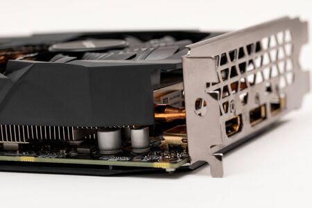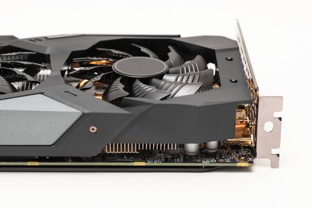 Video Graphics card with powerful GPU isolated on white background, uncovered cooler and fan
