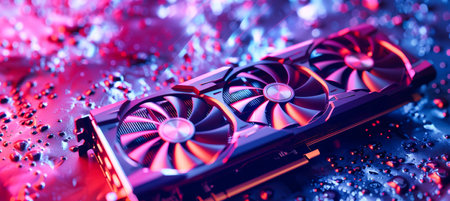 Close-up of a high-end graphics card with three fans, bathed in pink and blue light. Water droplets on surface create visual interest.