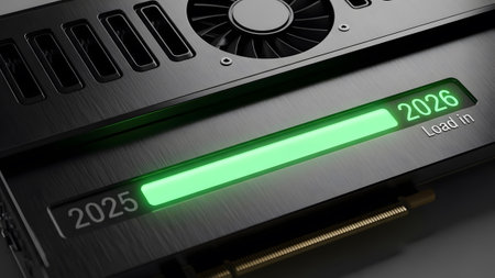 Close-up of computer hardware with a glowing green progress bar indicating 2026 loading.
