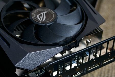 Computer gaming GPU graphic card with fan close-up macro shot.