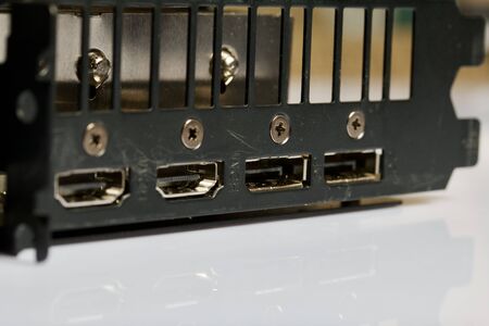 Most advanced graphics card with cooling fans. Side view. Close up.
