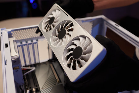 Close-up high performance graphic card with cooling fan and multicolor LED RGB light show status on working, inside of computer PC Case and DIY