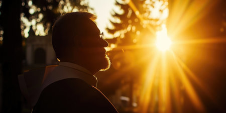 Divinity's Embrace: Close-up of Priest in Sun's Glow
