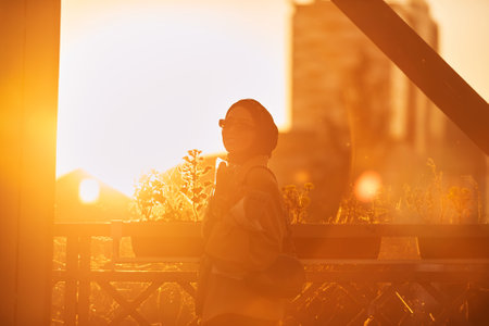 A woman's silhouette is captured against a vibrant golden sunset, the sun positioned perfectly behind her profile, creating a sun-kissed effect. The warm light evokes a sense of peace.