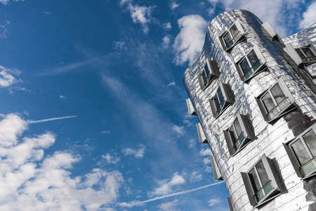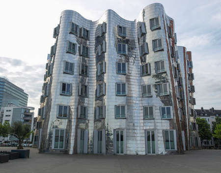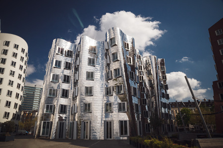 Dusseldorf, Germany - September 14, 2014: Exterior of futuristic building Neuer Zollhof at Dusseldorf Media Harbor.This building complex was designed by Frank O. Gehry and completed in 1998.