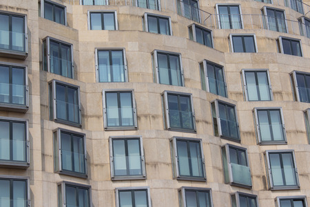 Modern European architecture concept. Urban residentil multi-storey multicolored building with many glass windows, wrapped design