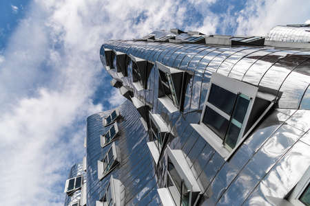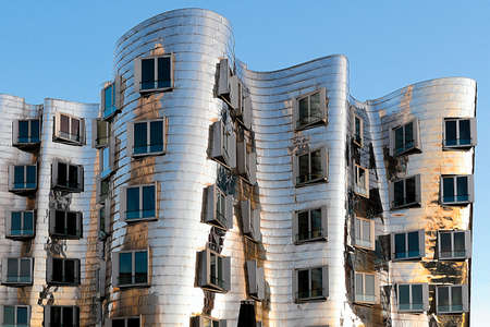 Closeup view of Frank Gehry's famous modern buildings at Neuer Zollhof in Dusseldorf, Germany.