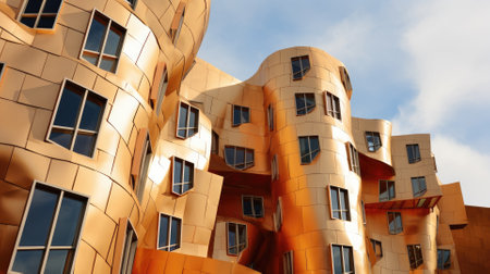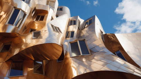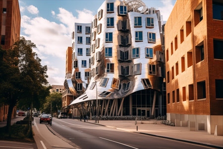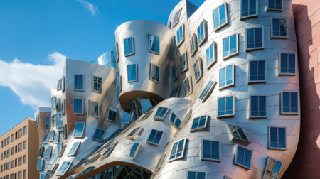 This building design draws inspiration from the deconstructivist architectural style, utilizing fragmented and non-rectilinear forms to create a visually striking and dynamic structure