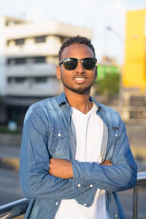 Happy young African bearded man smiling with arms crossed on the footbridge