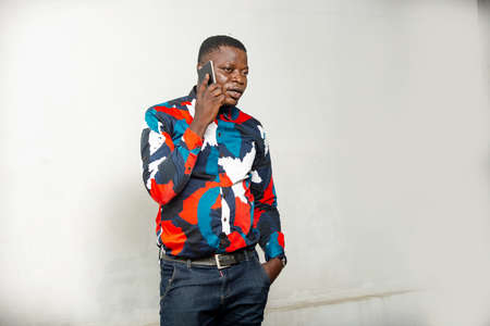 Portrait of African young man in bright shirt with bracelets on his arm posing at camera against blue background