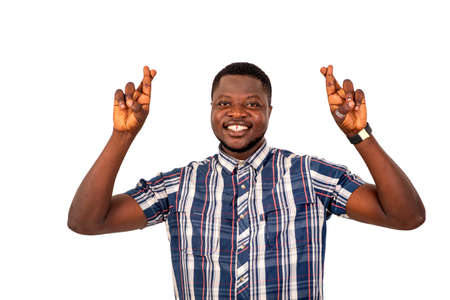 portrait of a handsome happy young man crossing his fingers while smiling at the camera.