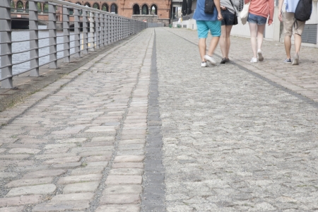 Blurred legs of walking people. Motion blur of pedestrians on the sidewalk.