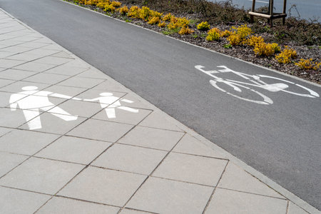 Roadmarking, pedestrian and bicycle signs on the road. Sidewalk for pedestrians and cyclists on asphalt surface in the park. No people.
