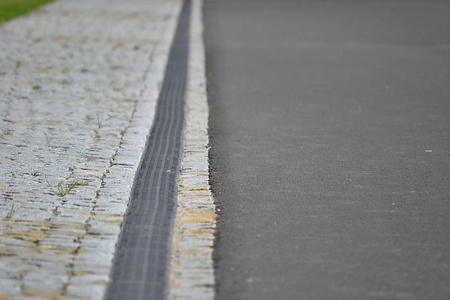 area in city. Tile on road. Tile coating of area. Street details on summer day.