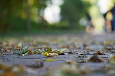 Autumn background top view. Man stands on a wet asphalt covered with fallen yellow leaves, pov