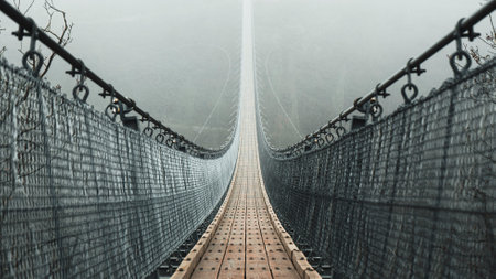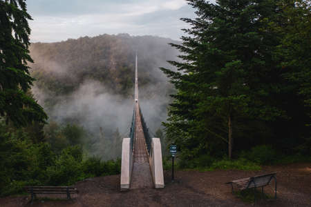 A tense perspective of a slender suspension pathway vanishing into fog-laden woods, evoking mystery and adventure in a secluded natural setting.