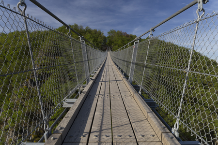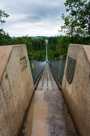 aerial view Germany's longest rope suspension bridge 300 feet above a canyon floor Geierley. It is between the towns of Morsdorf and Sosberg