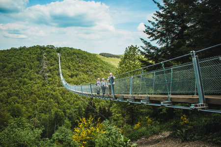 Geierlay, Morsdorf, Germany - July 11, 2017: Holidaymakers cross Germany's longest rope suspension bridge 300 feet above a canyon floor Geierley. It is between the towns of Morsdorf and Sosberg