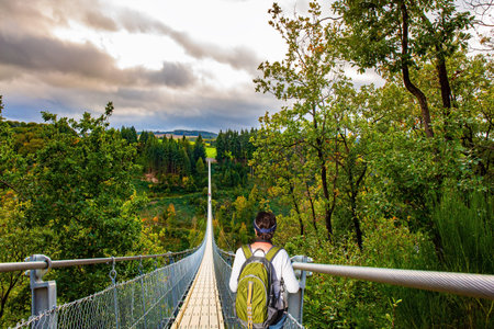 The magnificent Geyerlei is the longest suspension cable bridge. Germany. Elegant woman with a backpack admires the beautiful landscape. Windy and cold autumn day