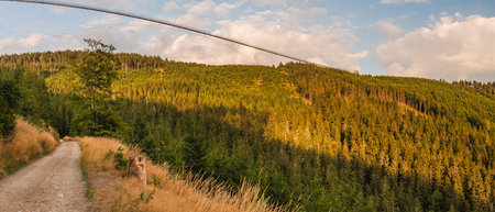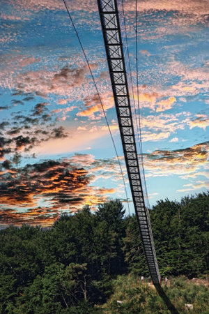 Aerial view of the worlds longest 721 meter suspension footbridge Sky bridge and observation tower the Sky walk in the forest, between mountains, Dolni Morava Ski Resort, Czech Republic.