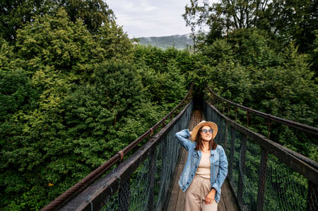 Girl in a straw hat and casual jeans jacket stands on the suspension cable bridge surrounded wild forest. Travel concept