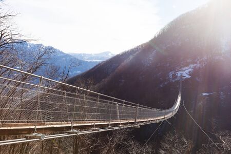 Landscape view of Long Steel Suspension bridge. Old small wooden bridge across river only for pedestrian. Mountain river surrounded by mountains and alpine forest.