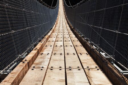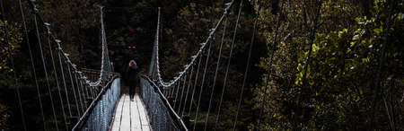 Pendant bridge is photographed with diminishing perspective. Female tourist is trekking along hiking trail of the Little Bear's Ring.