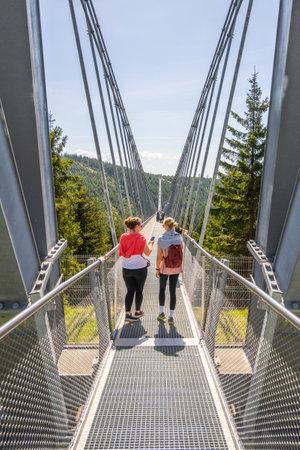 Two people walk along the Sky Bridge 721 in Dolni Morava Resort, Czechia. The bridge is a long, suspension footbridge that offers stunning views of the surrounding forest.