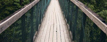 Walking legs and feet on wooden bridge with safety tools and surrounded by black net. Under bridge is tropical evergreen forest.