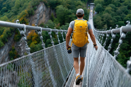 Scenic suspension bridge stretches across a vibrant green forest gorge on a bright, sunny day.