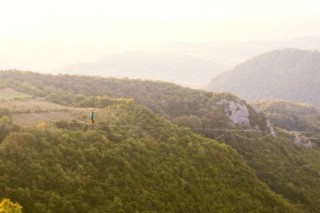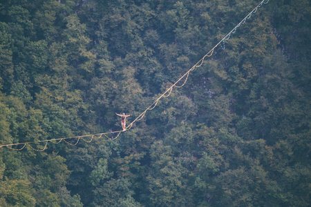 A man is walking along a stretched sling. Highline in the mountains. Man catches balance. Performance of a tightrope walker in nature. Highliner on the background of the mountains.