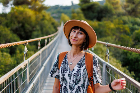 Girl with a backpack. outdoor portrait of a young woman walking on a suspension bridge over a river. Travel and adventure.