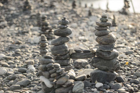 two pyramids of sea smooth stones of different shades lie on the coast, around still smooth stones