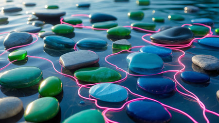 AI Generated. Colorful stones resting in reflective water with neon lighting accents